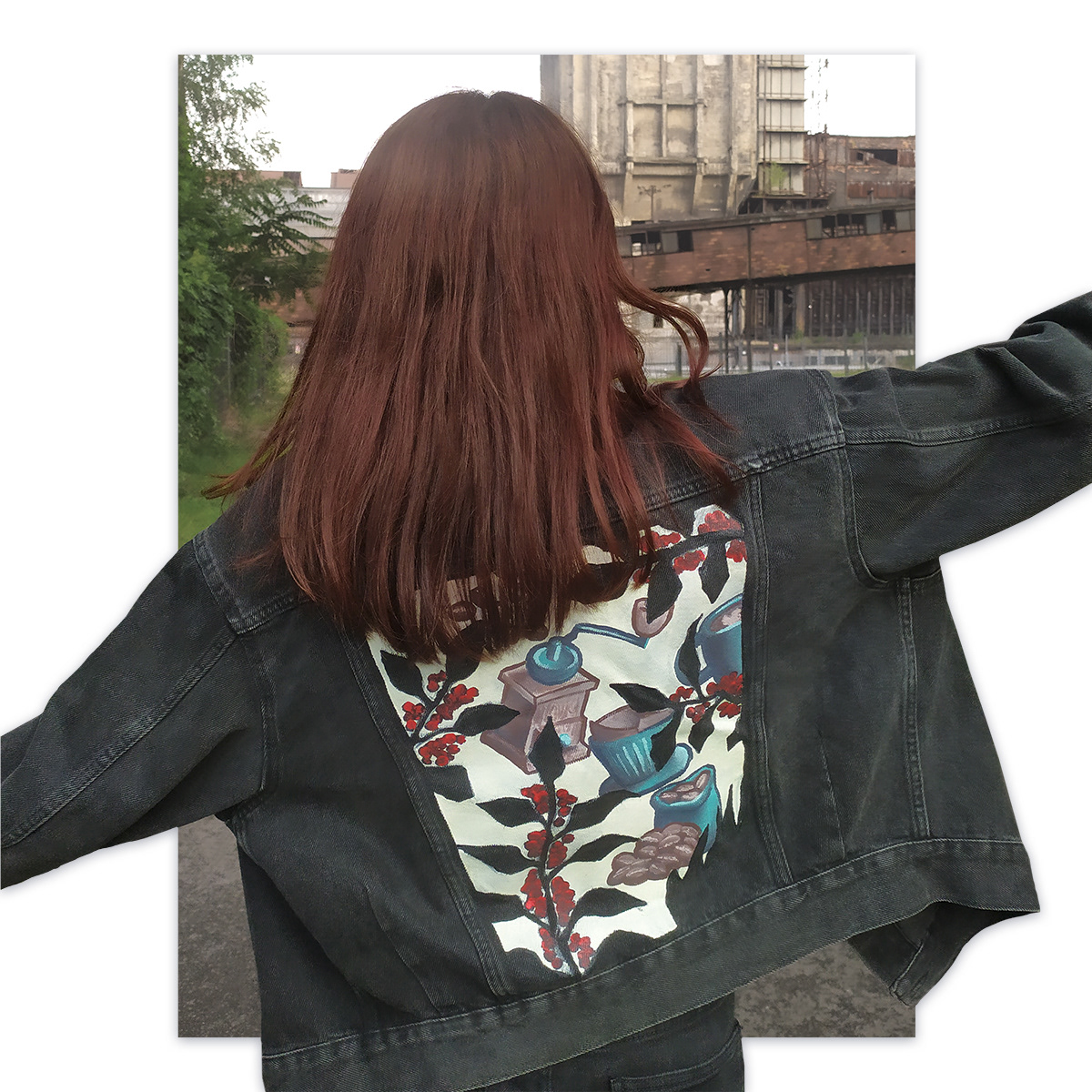 Akrylové barvy jsem zředil spešl přídavkem na látku, takže barva dobře na bundě drží.